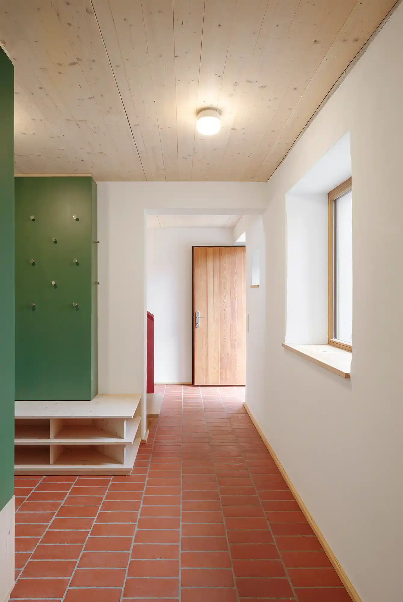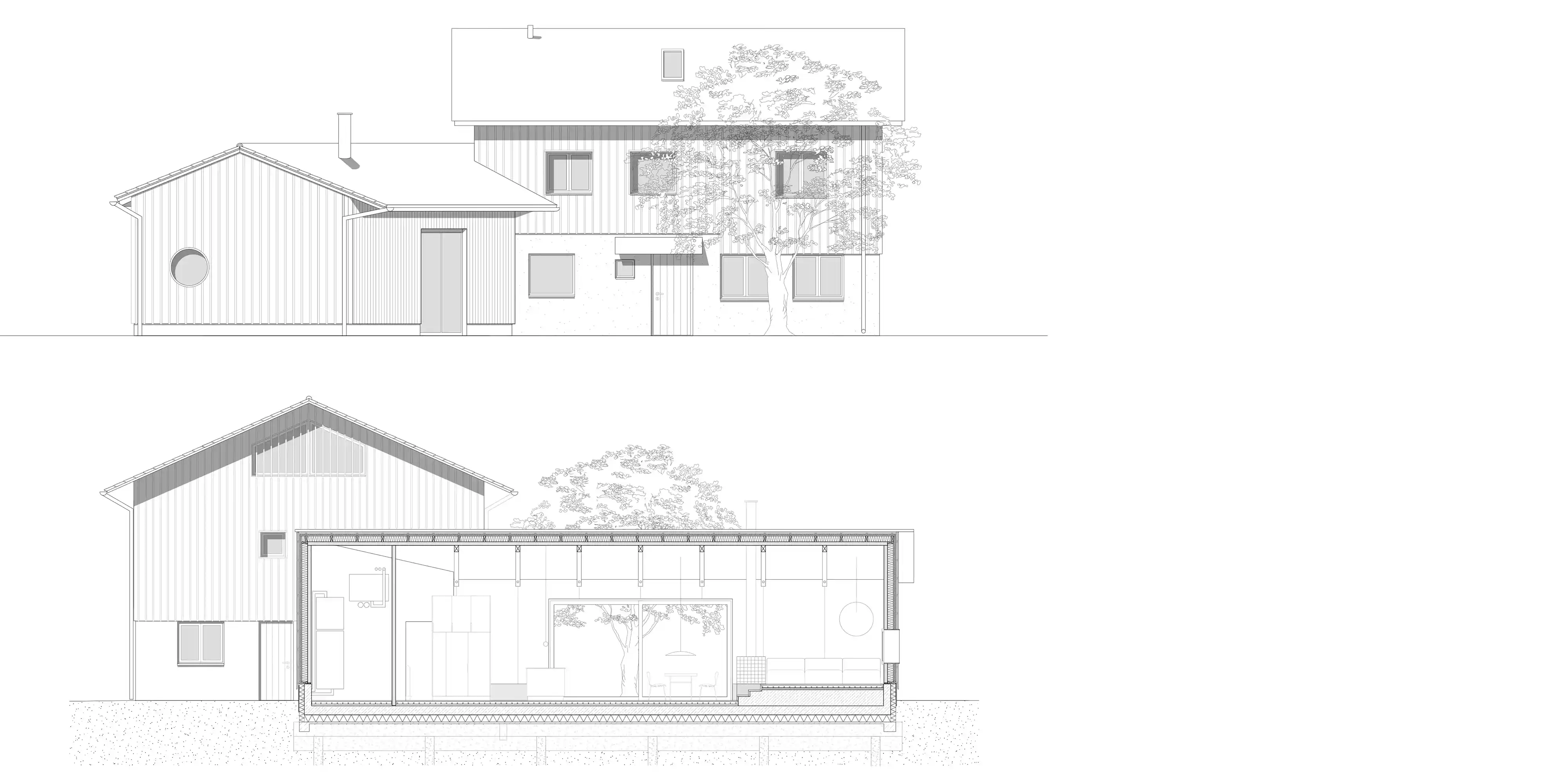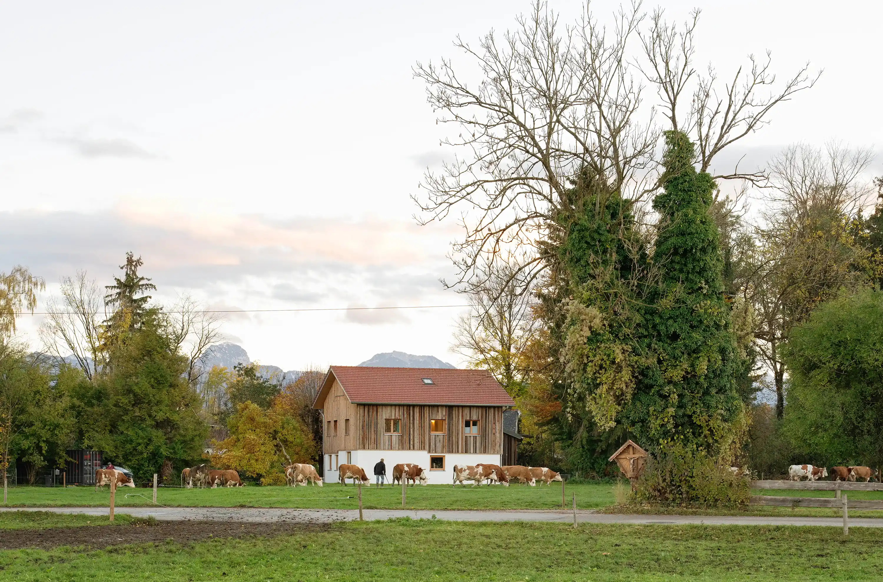 Dazu wurde das zweigeschossige Bestandsgebäude in seiner Gestalt, seiner klaren, bäuerlichen Grundrissstruktur und seiner Mauerwerkssubstanz erhalten. Die unterdimensionierten Holzbalkendecken wurden durch Brettsperrholzdecken ersetzt. Das Nebengebäude, welches Garage, Brennstofflager und einen Abstellraum enthielt, wurde durch einen aus Brettsperrholz errichteten eingeschossigen Neubau ersetzt.