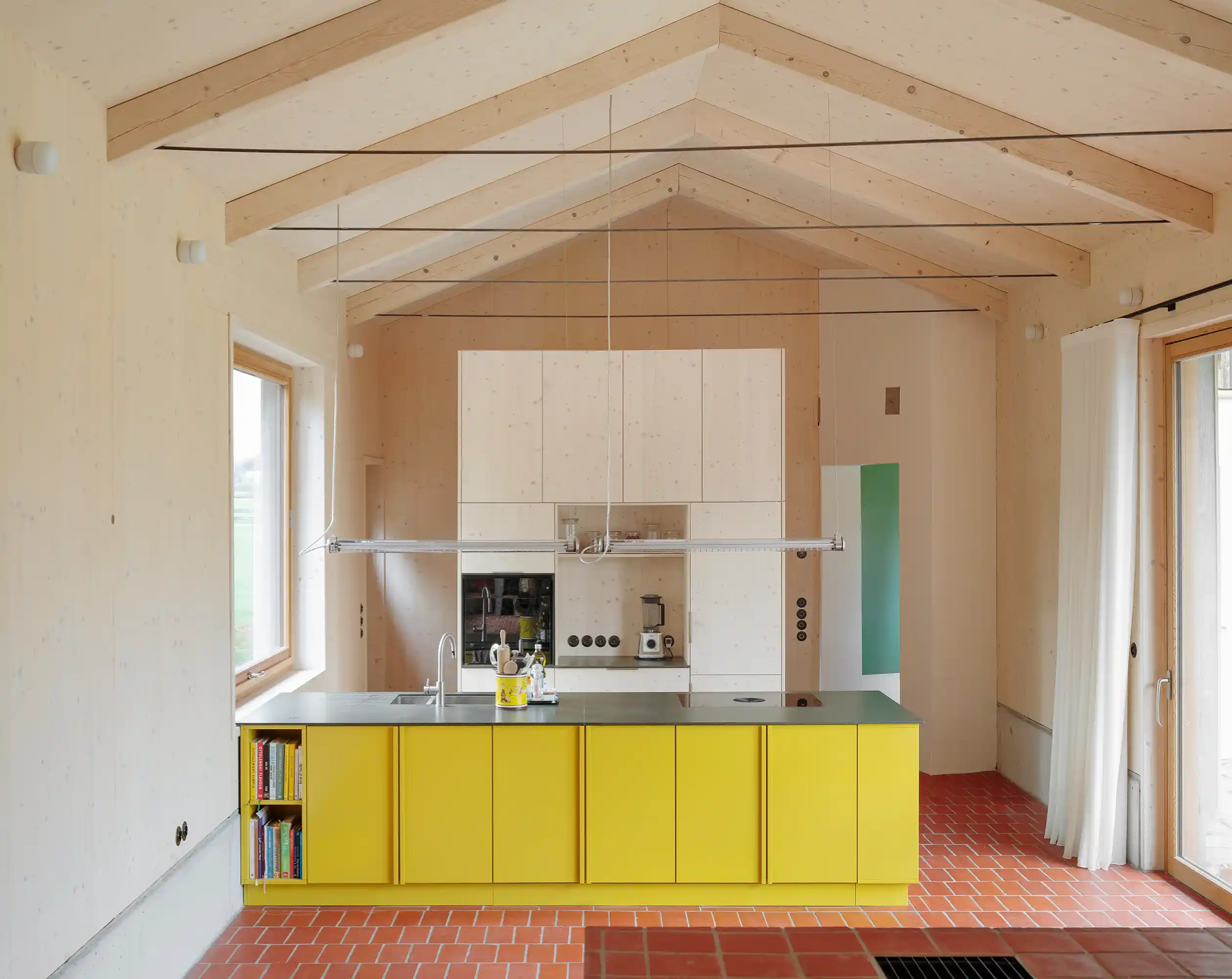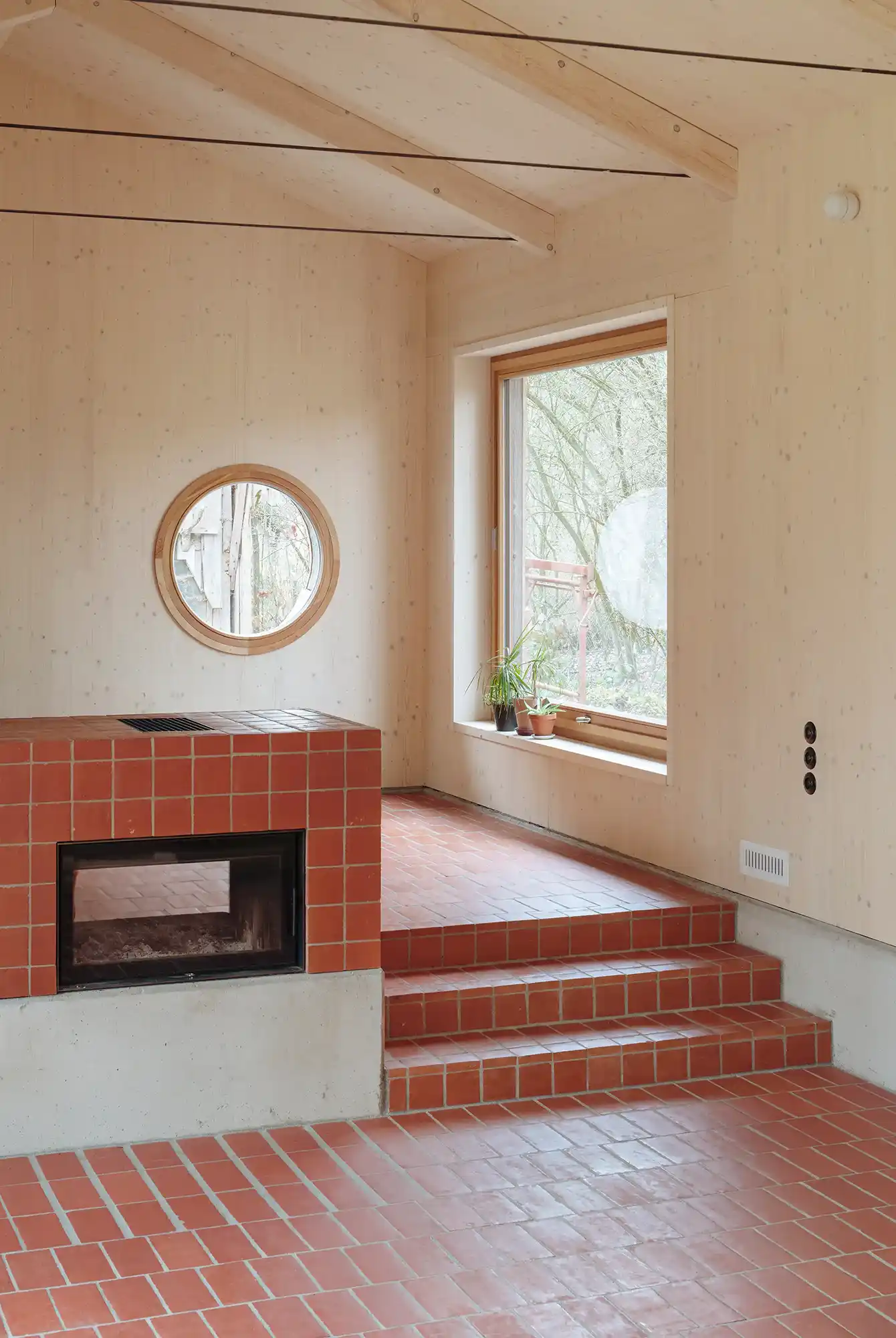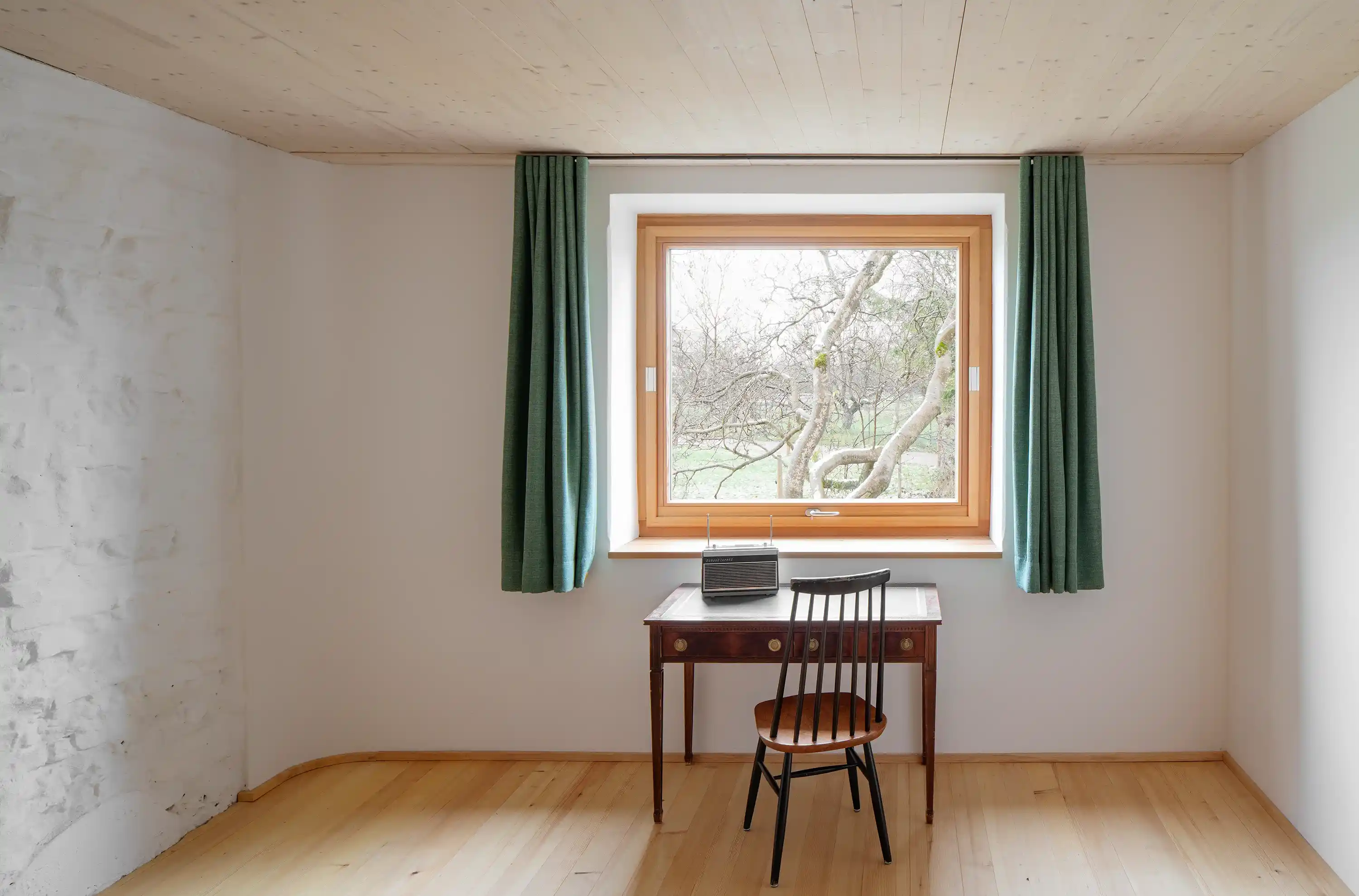 Dazu wurde das zweigeschossige Bestandsgebäude in seiner Gestalt, seiner klaren, bäuerlichen Grundrissstruktur und seiner Mauerwerkssubstanz erhalten. Die unterdimensionierten Holzbalkendecken wurden durch Brettsperrholzdecken ersetzt. Das Nebengebäude, welches Garage, Brennstofflager und einen Abstellraum enthielt, wurde durch einen aus Brettsperrholz errichteten eingeschossigen Neubau ersetzt.
